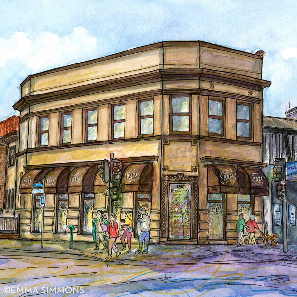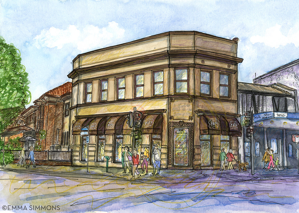 EmmaJane's Illustration of Papp’s in Haberfield is a hand signed Giclée Fine Art Print (Museum Quality using archival pigment inks on fine art paper) of the original water colour, ink and pencil artwork.