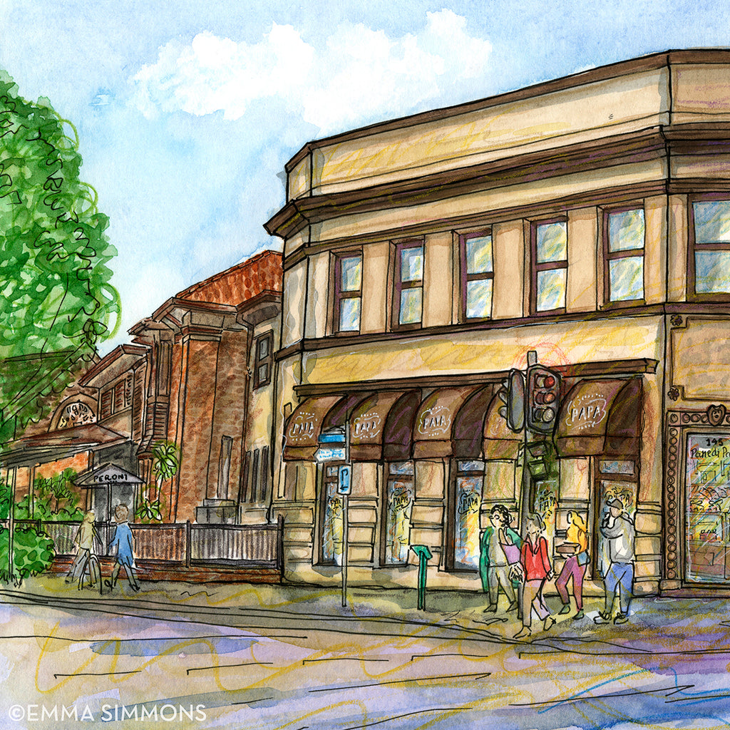 Nestled in the heart of Haberfield and delighting locals for over 35 years, this beloved patisserie is celebrated for its authentic Italian treats and family run spirit. Emma’s original watercolour pays tribute to the local institution affectionately called Papa’s.
